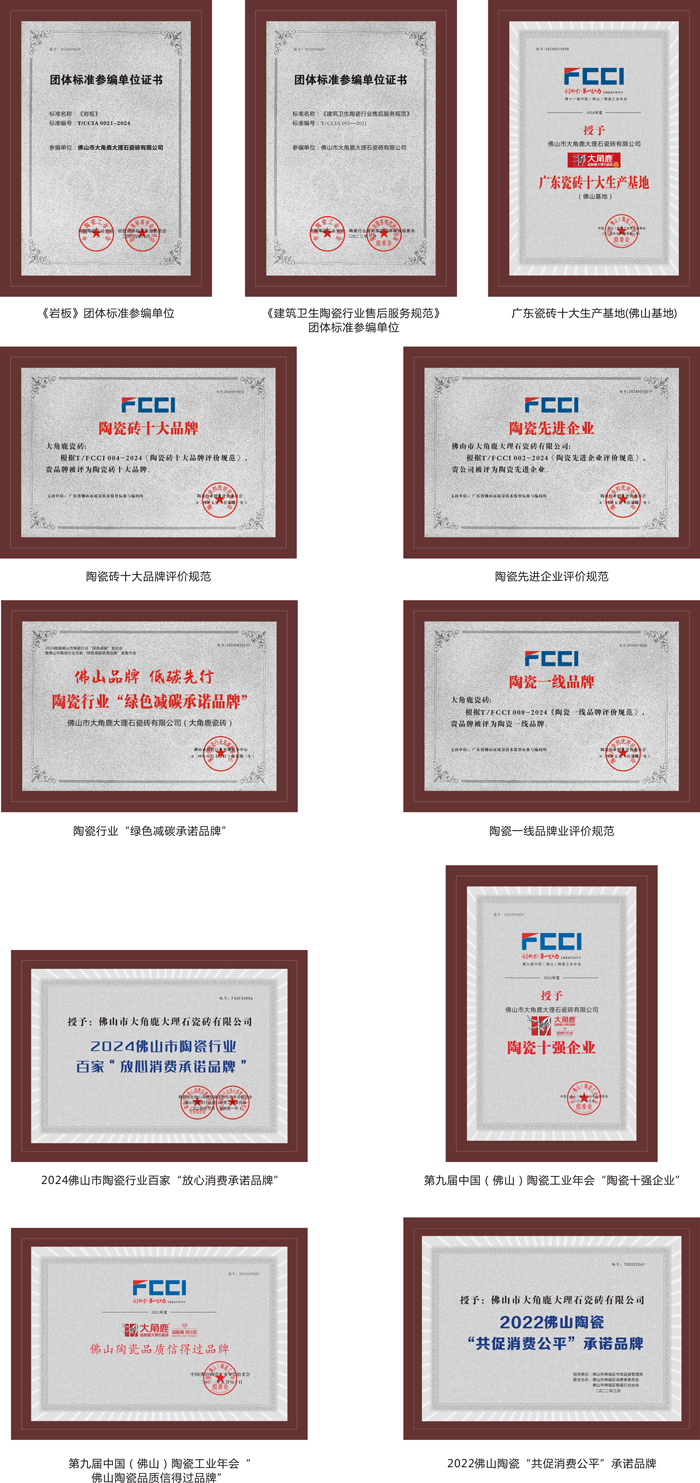 大角鹿專注于高品質(zhì)超耐磨大理石瓷磚的研發(fā)、設計、生產(chǎn)與應用,在中國瓷磚綠色環(huán)保示范基地——佛山西樵和廣東開平、新豐等設有六大生產(chǎn)基地,擁有中國陶瓷工業(yè)協(xié)會授予的“中國超耐磨陶瓷新材料研究院”和“大理石瓷磚研究所”、中國建筑衛(wèi)生陶瓷協(xié)會授予的“超耐磨陶瓷新材料研究中心”、聯(lián)合意大利卡羅比亞釉料公司成立的“超耐磨鉆石釉中國研發(fā)中心”四大研發(fā)中心以及中國建筑材料流通協(xié)會授予的“中國超耐磨陶瓷新材料示范基地”。
