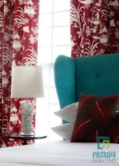 紅色和藍綠色。這是一種強烈的對比,但很吸引人。紅色襯托出來的溫暖氣氛被藍綠色冷卻下來。這種藍綠色是很讓人喜歡的水的顏色。可以為客房考慮一下這種顏色。我想墻要是紅色的也會很有趣,比如說是Benjamin?Moore's?Country?