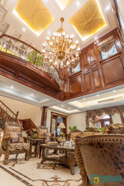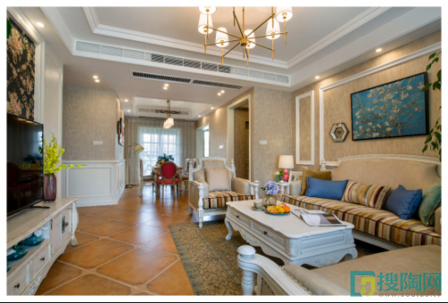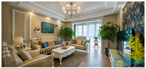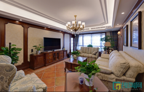 客廳經過精心布置。更通過突出飾品自身的魅力展示主人的富足和品位。地面及部分墻面運用了天然大理石做飾面,顯示豪氣尊貴而貼金箔的鏤空雕花與水晶珠簾的相映成趣,以及精致的沙發、美式的茶幾、個性化的臺燈,足以把路易十四時期的盛世再現。