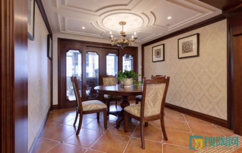 別墅的餐廳另有一番風味。最顯著的特點就是空間大,設計沒有改變原空間結構,而以深刻藍的風情珠簾將這種風格進行渲染,并在餐廳頂部設計圓形的彩繪玻璃,華燈閃爍珠簾隱隱,沒飲美酒,已不覺心醉神迷。