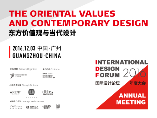 2016年12月3日,國際設計論壇(IDF)2016年度大會將在廣州設計周隆重舉行,本屆大會重磅邀請來自中國、中國香港、希臘、荷蘭、丹麥、英國、意大利等地11位設計領先人物匯聚一堂,從無界設計領域展開對“東方價值觀與當代設計”的分享與探討。