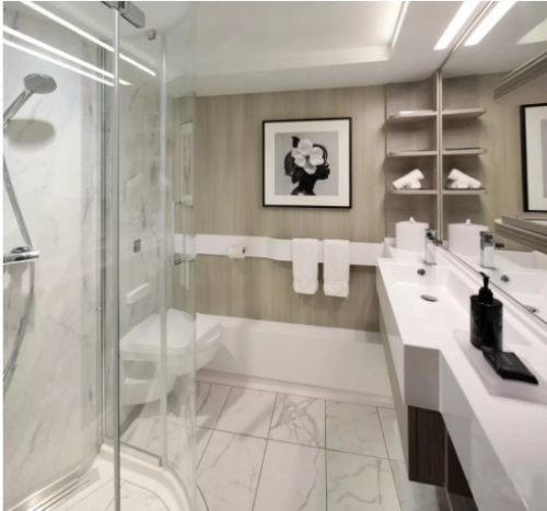 考慮到海上空氣潮濕,墻體長(zhǎng)期處于潮濕的環(huán)境下容易導(dǎo)致發(fā)霉,影響郵輪的美觀與體驗(yàn)感。LA'BOBO產(chǎn)品具有防潮、防滑、防火等性能,所以將明星產(chǎn)品卡拉卡塔PK02應(yīng)用在豪華套房的浴室墻體,持久耐用且符合郵輪豪華格調(diào)。