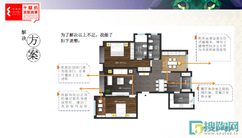 與原來的戶型圖對比,改造之后,客廳顯得方正,餐廳變得開闊,書房、茶室、客房三者合一。整體風格統(tǒng)一,關系明確。