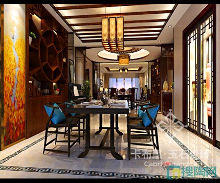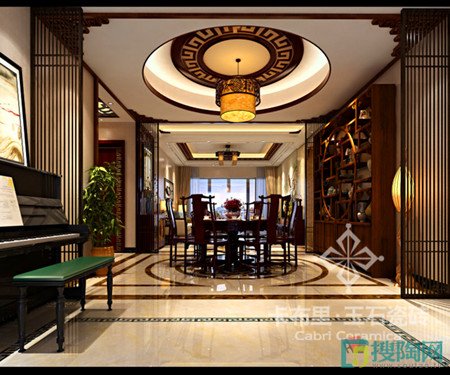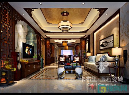 項目說明:地面以卡布里·玉石瓷磚拼花作為主角,上演玉石與紅木結合的大戲,兼之融入紅木沙發、酒柜屏風、雕花隔斷等元素,把風格氣質體現得淋漓盡致。同時墻面藝術漆的加入,使居家色彩更為濃重,而玉石瓷磚的合理應用更是提煉出了整個空間的精髓。