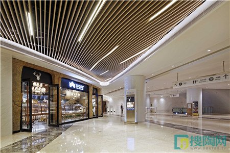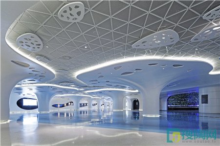 裙房室內設計的主元素使用了黃浦江為主題,以水而興的上海,城市的布局形態隨蜿蜒曲折的黃浦江而轉,充滿著流動性;城市的文化形態隨流動自由的城市布局而變,充滿著包容性。