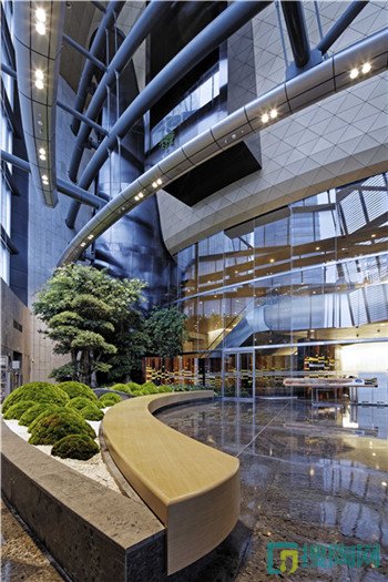 裙房會議中心區域的室內空間首先對建筑形態進行呼應:上海中心大廈整棟建筑是以120度的“旋轉”而聳立的摩天大樓。