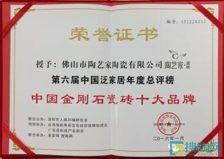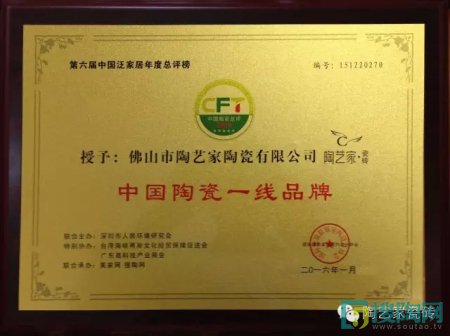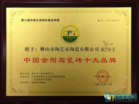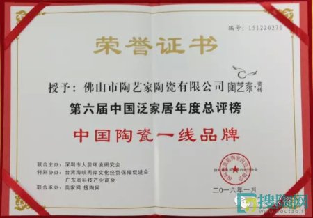 2016年1月7日,在中國(guó)泛家居十大品牌總評(píng)榜和中國(guó)泛家居領(lǐng)袖品牌論壇上,中國(guó)陶瓷行業(yè)十大品牌之一陶藝家瓷磚作為活動(dòng)主辦單位的特邀品牌,參與了此次盛會(huì)。論壇上,經(jīng)過(guò)近百名專家、行業(yè)領(lǐng)袖和權(quán)威人士的嚴(yán)格評(píng)審,陶藝家瓷磚又一次摘得桂冠,榮獲“中國(guó)陶瓷一線品牌”、“中國(guó)金剛石瓷磚十大品牌”的榮譽(yù)稱號(hào)!
