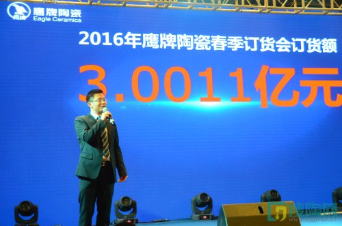 發布會上,鷹牌營銷中心總經理付和平公布了鷹牌春季訂貨會上訂貨額,鷹牌陶瓷兩小時便創下了3.0011億元的訂貨額,這樣的成績足以彰顯鷹牌陶瓷強大的品牌實力與渠道銷售力。在陶瓷行業整體低迷的背景下,鷹牌在這個春天所創造的奇跡,給了行業足夠的信心。