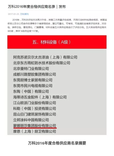 2017年1月,一年一度的萬科供應(yīng)商評(píng)估結(jié)果出爐,蒙娜麗莎集團(tuán)繼2015年獲評(píng)A級(jí)供應(yīng)商后,再度獲評(píng)為萬科2016年度A級(jí)供應(yīng)商,成為行業(yè)內(nèi)唯一獲評(píng)A級(jí)的供應(yīng)商,這體現(xiàn)了蒙娜麗莎瓷磚的產(chǎn)品、質(zhì)量、品牌和服務(wù)得到市場(chǎng)的充分認(rèn)可。