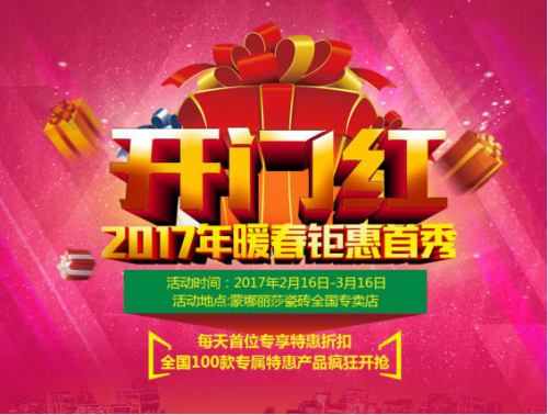 全國終端門店新春開市喜迎賓客!活動期間,凡購買蒙娜麗莎瓷磚,每天首位下定客戶,在原來產品折扣的基礎下再享“開門紅”折扣。每天僅限一個名額,快來搶購吧!(詳詢當地門店)