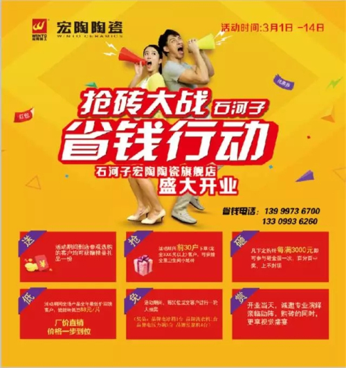 如此盛惠,勢必在3月的石河子刮起一道搶磚風,石河子宏陶陶瓷旗艦店也將持續為廣大石河子業主提供品質產品,周到服務,同時也盛邀各位一同參與3月1日—14日的《搶磚大戰·省錢行動》。