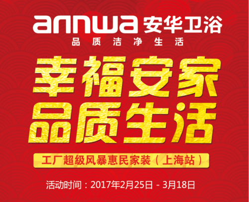 伴隨著新一年春節過后的余溫,新一輪家裝熱潮蓄勢待發,2017年2月25日,安華衛浴工廠總部在上海吹響了促銷活動的號角,此次主題為“幸福安家 品質生活”的3.18惠民家裝活動,是安華工廠在上海舉辦的大型讓利促銷活動。本次活動由安華衛浴總部全盤策劃,直達上海全面讓利,以頂級的品質,實惠的價格感恩回饋千千萬萬的上海業主,讓所有消費者買的放心、用的舒心。