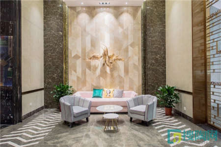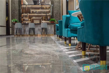最吸睛的要屬墻上的拉絲香檳金藝術品,搭配著亮光面、綢光面、自然三種釉面切割打造的藝術背景墻,在頂部射燈光線照耀下,亮面與暗面的交織下,展現出奇妙的視覺效果,時尚的智慧縈繞其中,藝術范十足。