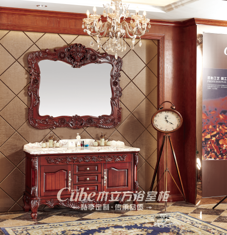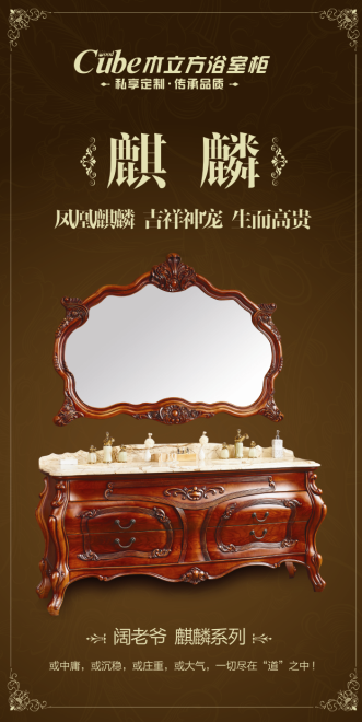 木立方浴室柜闊老爺系列以中式園林式建筑、色彩等設計造型為代表。其特點是對稱、文化性強,格調高雅,具較高審美情趣和社會地位象征。