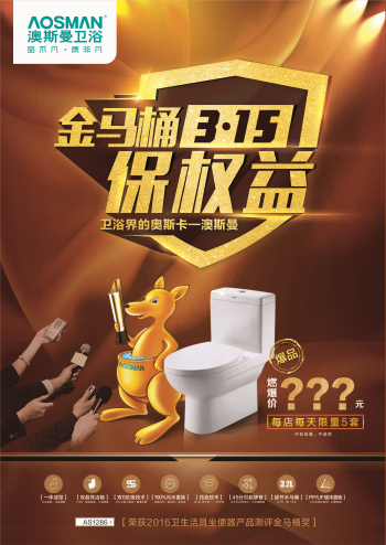 315是消費者權益保障的一個重要節日,為了回饋廣大消費者對澳斯曼衛浴的厚愛,澳斯曼“金馬桶 保權益”的誠信回饋活動正在全國各地專賣店大力推行,旨在以質量誠信社會,以服務滿足客戶,讓廣大消費者在選購衛浴產品過程中更省心、省時,又省事,帶給你更舒適、優質、健康的品質生活體驗!