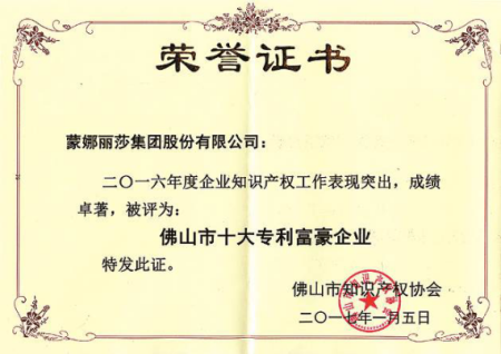 2017年新春伊始,蒙娜麗莎專利工作捷報不斷,先后榮獲“佛山市十大專利富豪榜”、“南海區知識產權優秀企業”。“佛山市十大專利富豪榜”是國內首個以專利為標準編制的企業排行榜,體現了上榜企業在專利申請、管理、保護、運用、人才培養、資源配置方面的綜合實力。