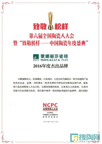 2016年12月28日,由中國建筑衛生陶瓷協會、陶瓷信息聯合主辦的第六屆全國陶瓷人大會暨“致敬榜樣”中國陶瓷年度頒獎盛典在佛山智慧新城隆重舉行,蒙娜麗莎瓷磚以“謀實、謀變、謀新”的發展姿態榮膺“2016年度杰出品牌”稱號。