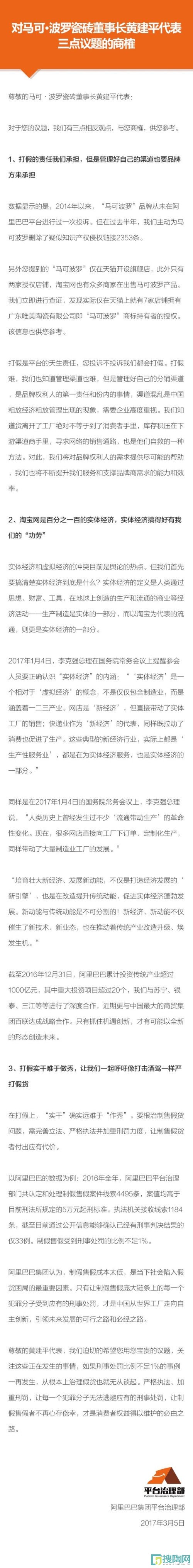 近日,全國(guó)人大代表、馬可波羅瓷磚董事長(zhǎng)黃建平即將在兩會(huì)提案中重點(diǎn)關(guān)注網(wǎng)絡(luò)打假、振興實(shí)體經(jīng)濟(jì),并將“喊話”馬云的消息引起關(guān)注。今天,阿里巴巴集團(tuán)已迅速做出了“針鋒相對(duì)”的回應(yīng)。