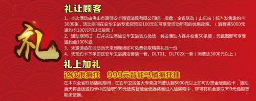為答謝齊魯大地新老客戶一直以來的支持和厚愛,由安華衛浴總部主辦的“智能衛浴節”省級聯動活動于2017年2月21日至2017年3月25日強勢拉開帷幕。