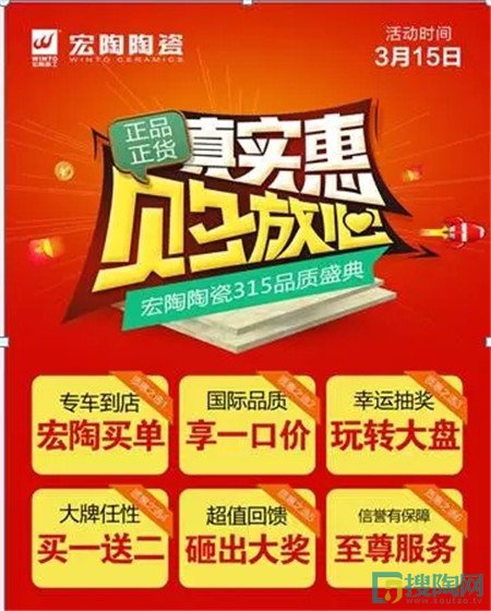 一年一度的3.15促銷活動如野火乘春風之勢燎燃全國。2017年,是第35個“國際消費者權益日”,在這35周年慶之際,宏陶陶瓷也早早地做好了3.15做促銷活動的準備。此次3.15宏陶陶瓷以“真實惠 放心購”為主題,以誠信3.15,瓷磚品質盛典”為副標,站在消費者的角度著想,真真實實把實惠送到全國各地消費者手中。