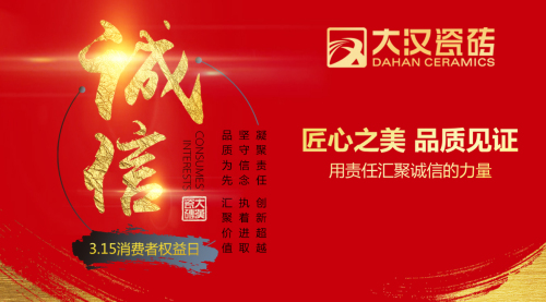 從中國制造到中國創造,大漢瓷磚,堅守誠信,創新與匠心,引領中國瓷磚產業革新發展中穩步前行,讓不一樣的瓷磚消費體驗,為消費者權益保駕護航,為中國創造發聲!
