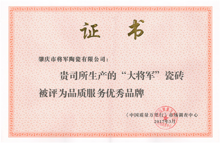 而大將軍陶瓷作為擁有多年建陶歷史的品牌,一直以來狠抓產(chǎn)品質(zhì)量,并且始終堅(jiān)持“品質(zhì)、策略、服務(wù)、共贏”的市場理念,規(guī)范生產(chǎn)、誠信經(jīng)營。以質(zhì)量立命,以服務(wù)取勝。在產(chǎn)品上立足品質(zhì)生產(chǎn),持續(xù)創(chuàng)新,引領(lǐng)行業(yè)潮流,服務(wù)上始終如一,堅(jiān)持提供貼心到位的一站式服務(wù),廣受好評。《中國質(zhì)量萬里行》對大將軍陶瓷產(chǎn)品的質(zhì)量認(rèn)證,更加肯定了社會和消費(fèi)者對大將軍陶瓷產(chǎn)品的認(rèn)可。