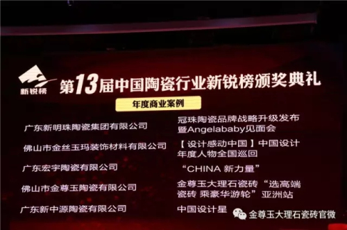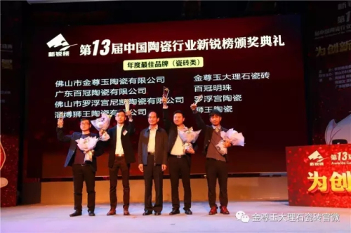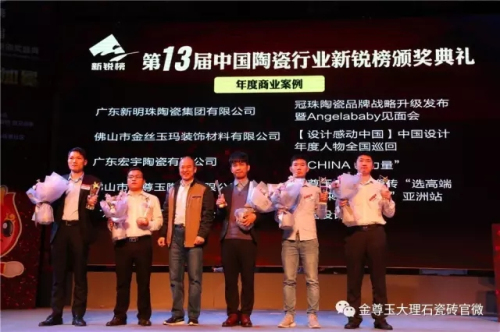 金尊玉大理石瓷磚不負眾望,分別攬走 “年度最佳品牌”、“年度商業案例”兩項桂冠;金尊玉大理石瓷磚董事長、“新一代陶瓷人”南順芝眾望所歸拿下“年度大工匠獎”——三大榮譽,金尊玉大理石瓷磚真正成為本屆新銳榜的大滿貫得主。