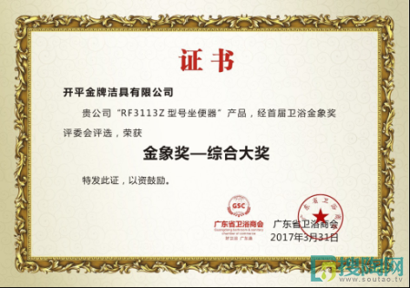 金牌衛浴榮膺“金象獎·綜合大獎”