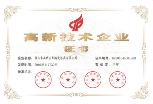 安華衛浴獲“高新技術企業”認證