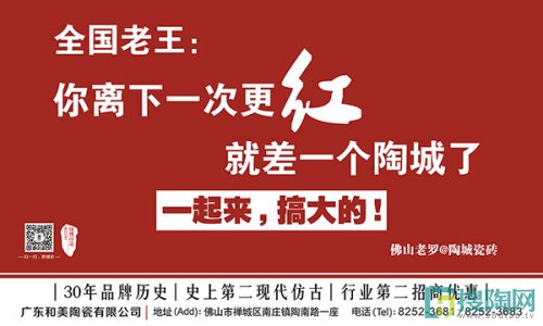 2017年,陶城瓷磚銳意進取,勇往前行,大動作不斷。 “陶瓷十大品牌”的獲得只是一個開始,4月18日春季陶博會,陶城瓷磚又將有大動作了。請你鎖定陶城瓷磚,屆時蒞臨陶城展廳,你離下一次更“紅”,就差一個陶城了!