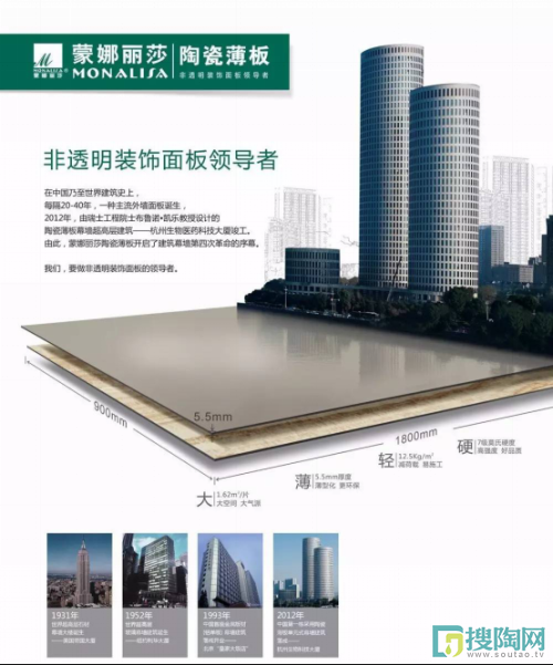 “薄、輕、大”900X1800mm,厚度僅有5.5mm的陶瓷薄板在建陶市場上猶如一顆冉冉升起的新星,以“既能上墻、又能下地、內外兼修的廣泛用途和高附加值”的特點成為各方關注焦點。從業內人士到工程商、消費者,無不為陶瓷薄板的“大”與“薄”而瘋狂!蒙娜麗莎可以說是國內陶瓷薄板的創領者,引領著陶瓷薄板在業內外掀起一一輪又一輪的陶瓷裝飾革命。