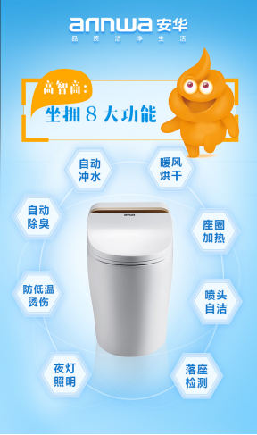 高智商的安華衛(wèi)浴“睿盾”更坐擁八大功能:自動沖水、自動除臭、防低溫燙傷、夜燈照明、落座檢測、噴頭自潔、座圈加熱、暖風(fēng)烘干。