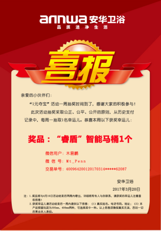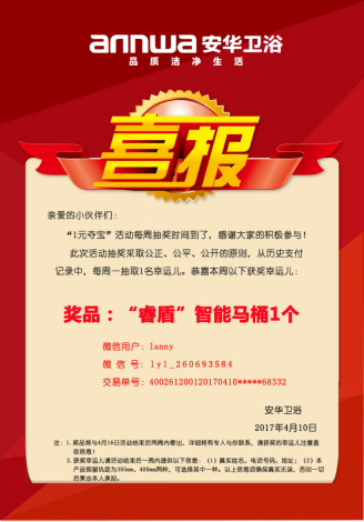 2. 獎(jiǎng)品將4月16日后兩周時(shí)間會(huì)安排寄送馬桶,部分運(yùn)費(fèi)需要獲獎(jiǎng)?wù)咧Ц叮?br />