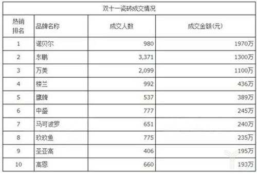 從數(shù)據(jù)來(lái)看,2014年雙十一當(dāng)日天貓瓷磚類目,全網(wǎng)線上成交總金額超1000萬(wàn);2015年總金額達(dá)到1億(也有人說(shuō)是超過(guò)6000萬(wàn)),銷售規(guī)模在1000萬(wàn)以上的有3家;2016年,排名第一的東鵬瓷磚單一品牌破2億元大關(guān),達(dá)到2.02億元;諾貝爾以1.7億元緊隨其中;金意陶和依諾分別以1.5億元和1.39億元位居第三和第四;此外,另有多家陶企達(dá)到千萬(wàn)級(jí)。