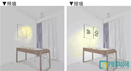 ▲圖左燈具垂直照墻,讓局部太亮,經(jīng)墻壁折射又產(chǎn)生了人眼輝度甚至眩光。圖右則不會,燈光擦墻,光線柔和均勻。