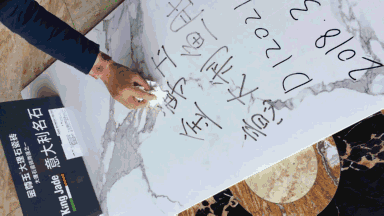 我們在光滑的磚面上寫上“金尊玉意大利魚肚白D12021”看看它的防污性質如何,數分鐘過去以后。