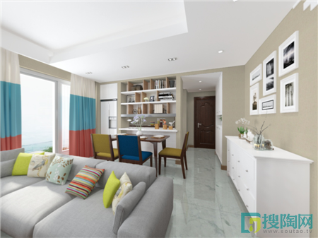 冷色調的瓷磚和墻面,加上淺灰色的布藝沙發,演繹的是一個低調簡約的家居風,而亮色的窗簾和抱枕作為家居環境的點綴,豐富了空間的視覺效果,令整個環境充滿了朝氣與活力。餐廳上使用亮色的椅子,也活躍了用餐的氛圍。