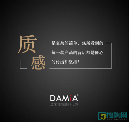 達米雅磁磚,作為一家專注質感現代仿古磚的高端品牌,自創立以來就一直堅持用心做好一片磚。每一片磚除了要有國際化的時尚花色,更需要具備超強的產品質感以及高品質的產品質量,超強的產品質感是達米雅磁磚一直以來的生命線。正是在這樣嚴格的工匠精神的引領下,達米雅磁磚贏得了來自日本、韓國、澳洲、美國等國際客戶的信賴,同時也吸引了一批高品質的經銷商的投資。