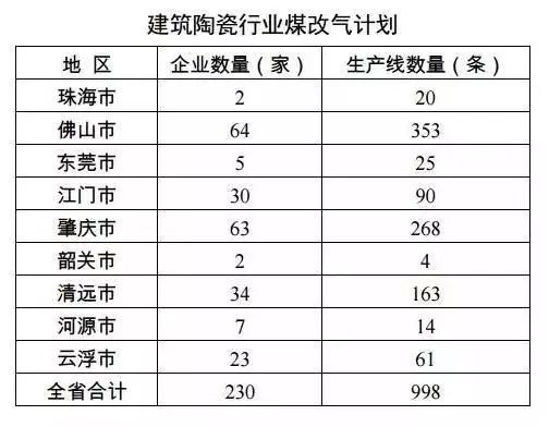 早在5月7日,廣東省環保廳在《廣東省打贏藍天保衛戰2018年工作方案》(以下簡稱《行動方案》)中曾列明了建筑陶瓷行業煤改氣計劃: