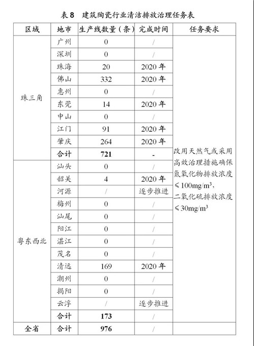▲《廣東省打贏藍天保衛戰行動方案(2018-2020年)(征求意見稿)》中的建筑陶瓷行業清潔排放治理任務表