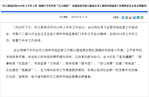 7月30日下午,佛山市工商局召開2018年上半年工作會議。會議傳達學習全國市場監管工作座談會、市委十二屆六次全會以及全省工商和市場監管部門半年工作會議精神,總結2018年上半年工作,部署下半年工作安排。