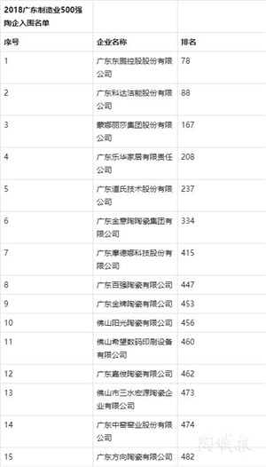 11月13日下午,廣東省制造業協會、廣東省產業發展研究院、廣東省社會科學院企業競爭力研究中心等聯合發布了《2019年廣東制造業500強企業研究報告》。陶瓷衛浴行業共有15家入選,包括:蒙娜麗莎、樂華家居、恒潔衛浴、金意陶、金牌、百強、嘉聯、樂華陶瓷潔具、方向、偉達、嘉俊、郭氏。上游領域則有科達潔能、道氏技術、摩德娜三家企業上榜。