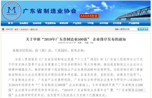 據了解,廣東省制造業協會、廣東省產業發展研究院、廣東省社會科學院企業競爭力研究中心于今年5月16日發布了《關于申報“2019年廣東省制造業500強” 企業排序發布的通知》,通知對本次申報資格、指標填報、申報方式、聯系方式等進行了相關說明。