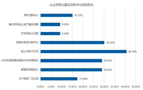 在企業信息化建設和數字化轉型方面,有40.70%的企業在實踐線上向線下引流。而運營體系部分實現數字化的占到了30.23%,這是一個可喜的進步,說明有近三分之一的企業已經在學習利用新技術為運營賦能。同時,有29.07%的企業初步實現了數據采集和分析的智能化,說明依靠技術去完成數據的采集和分析,得到越來越多的重視。遺憾的是,作為企業信息化建設的基礎工具ERP系統,廣泛使用的只占到17.44%。