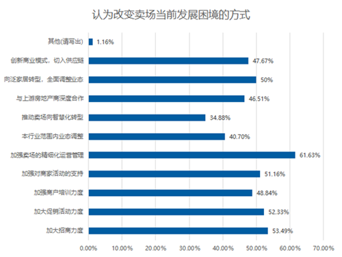 對于如何改變目前的困境,認為應該加強賣場的精細化運營管理的占比超6成,成為首選。同時選擇加大招商力度、加大促銷活動力度、加強對商家活動支持的企業,占比都超過了5成。有45%-50%的企業,選擇不同形式的商業模式創新。在向智慧化轉型方面,占比達到了34.88%。