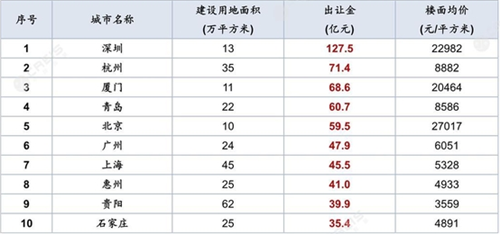 分城市來看,一線城市較二線城市土地交易更為活躍。上周40城出讓金總額環比激增,出讓金總量較前一周增加七成,TOP10榜單中,更有一半入榜城市收金超過50億元。10個城市中,一線城市北上廣深均入榜,二線城市占據6個席位。其中,深圳5宗住宅用地入市,建筑用地面積達13萬平方米,出讓金總額127.5億元居榜首。