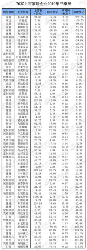 2019年第三季度家居上市企業(yè)年報已經(jīng)出爐,總結(jié)70家上市企業(yè)業(yè)績數(shù)據(jù)發(fā)現(xiàn),4家上市企業(yè)凈利潤為負(fù)值,19家企業(yè)凈利潤相比去年同期出現(xiàn)負(fù)增長。