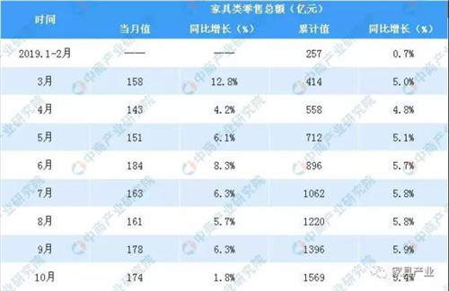 據國家統計局數據顯示,2019年10月,全國家具類零售額達為174億元,同比增長1.8%;2019年1-10月,全國家具類零售額為1569億元,與去年同期相比增長5.4%。