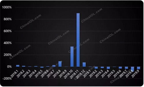 2018-2019.9中國對美空調出口量分月度同比變化(%)