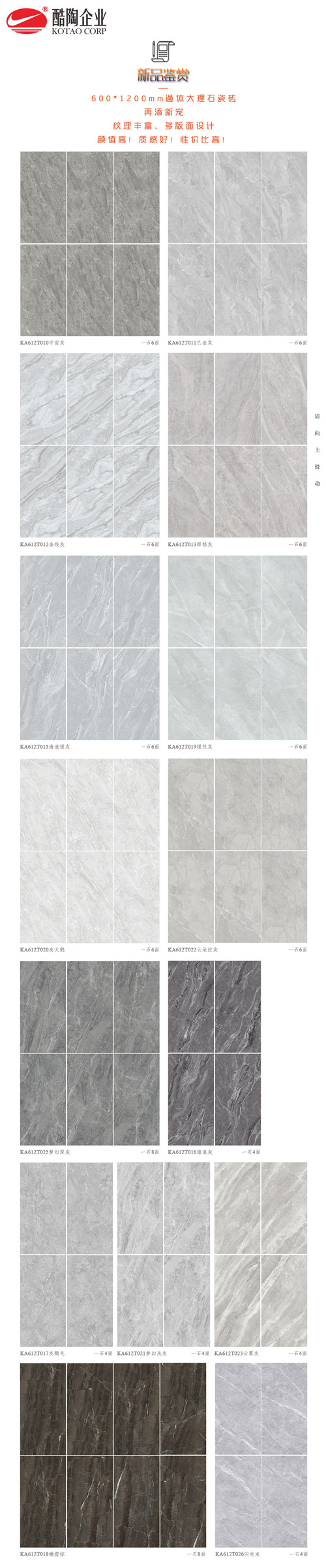在競爭漸趨激烈的市場形勢下,唯有堅實的產品品質,方能讓企業在競爭中立于不敗之地。自3月復工復產以來,酷陶企業堅持以品質先行,以滿足市場及客戶需求為導向,結合產品技術研發優勢,加大研發與創新投入,不斷研發創造了符合市場及客戶期待的好產品:超耐磨瓷拋磚、600*1200mm通體大理石瓷磚、800*800通體大理石瓷磚等,為全國經銷商及戰略合作地產商伙伴們提供充足優質的產品供應,強有力助推終端開戰2020。